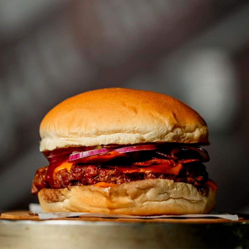 Pão, hambúrguer, bacon grelhado, queijo cheddar, picles, cebola roxa, ketchup