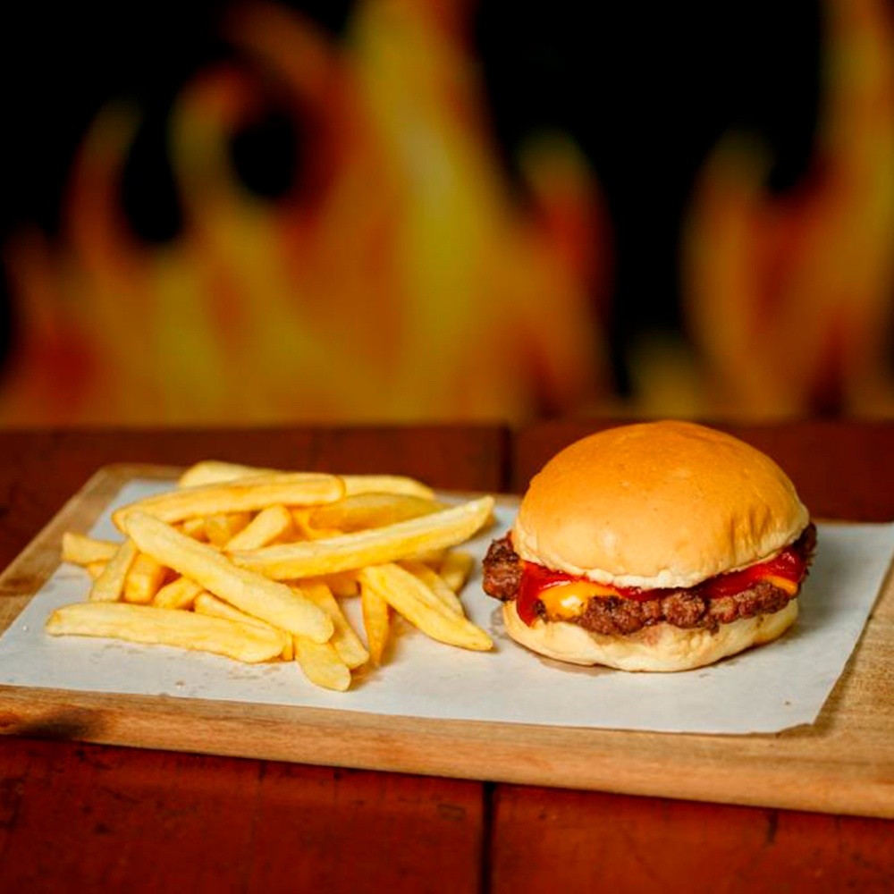 Pão fofinho da casa, hambúrguer 100g, queijo cheddar, ketchup