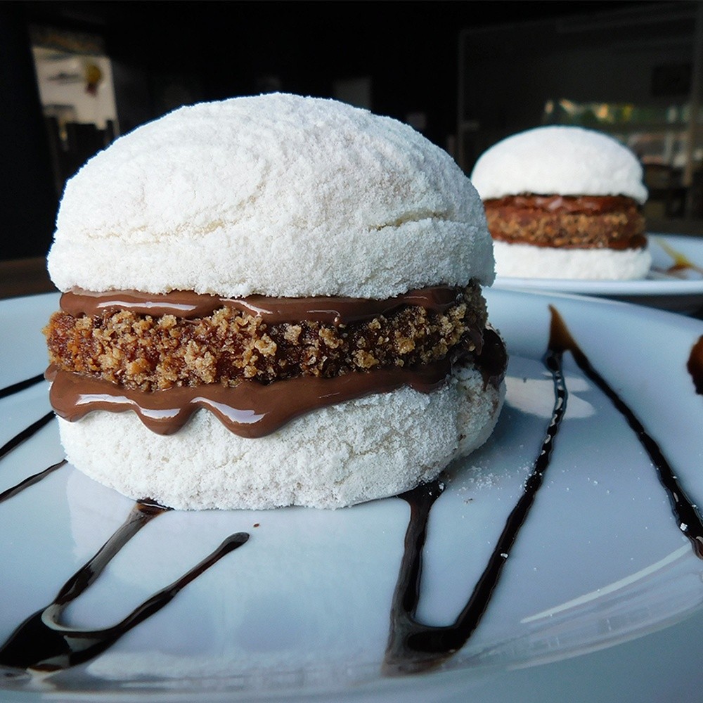 Hambúrguer de banana empanada, pão de leite Ninho, recheio de Nutella ou doce de leite