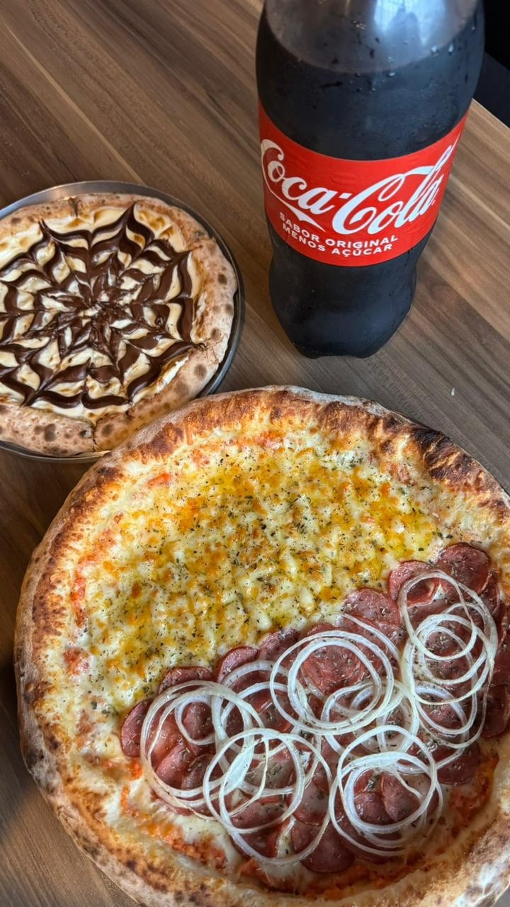 molho, mussarela, calabresa fatiada, cebola